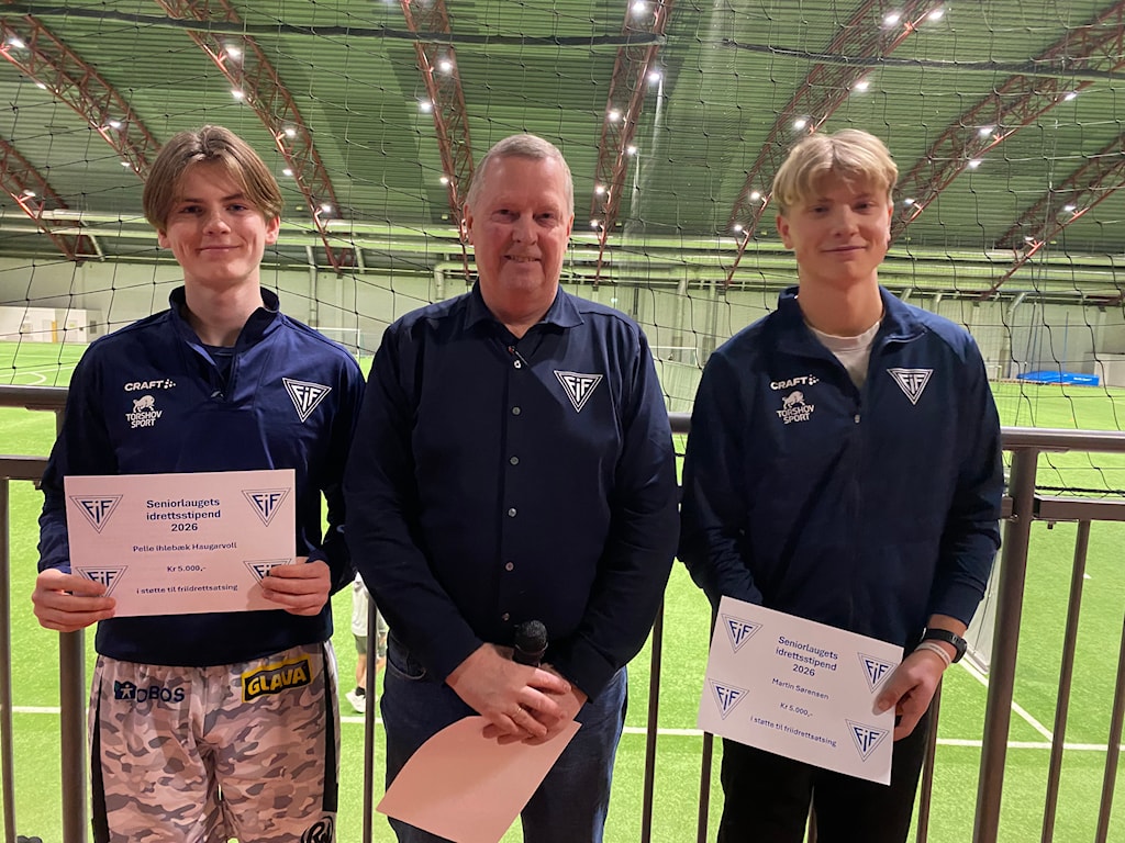 Pelle Ihlebæk Haugarvoll og Martin Sørensen fikk utdelt Seniorlaugets idrettsstipend av leder i Seniorlauget Tore Bjørnetrø.
